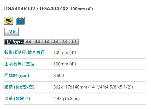 • DGA404RTJ2: 快速充電器 (DC18RC)及5.0Ah電池2pcs