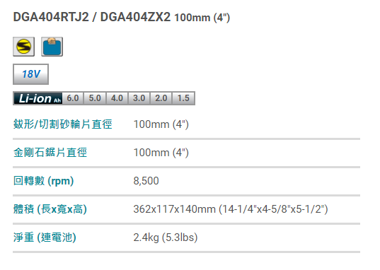 - DGA404RTJ2: 快速充電器 (DC18RC)及5.0Ah電池2pcs