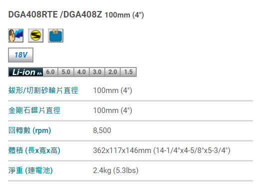 - DGA408RTE: 快速充電器 (DC18RC)及5.0Ah電池2pcs