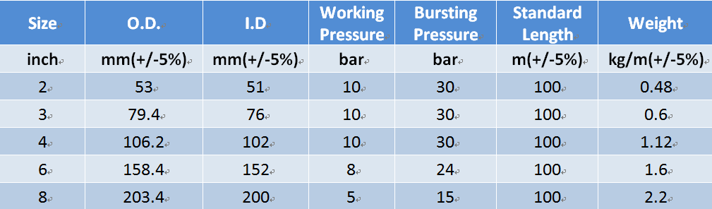 • This hose is designed as a standard duty hose for water discharge in agricultural irrigation, industrial and construction
