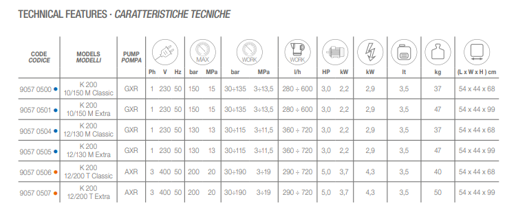 GXR motorpump with brass head and stainless steel pistons (monophase models); AXR motorpump with brass head and ceramic pistons (three-phase models)