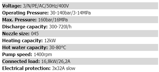 Robust, corrosion-resistant, self-supporting device chassis, impact-resistant device-cover made of ABS, stainless-steel hotwater-boiler with 65l capacity with pre-heating and buff er storage for immediate hot-water use and hot-water preparation during stand-by operation, triplex-piston pump with chrome nickel pump head (hot-water resistant), high-performance ceramic piston, stainless-steel valves, leakage-return, Etronic I - controls: (start-stop system with switch-off delay, stand-by system for heating, low-water cut-off ), unloader safety-valve c/w Infi nitely variable pressure and quantity re- gulation, 4 large rubber wheels for rough terrain, with a patented wheel brake 2-way, storage possibility for all accessories, 2 integrated detergent- tank with 20l capacity, 2-stage rotary on-off switch with stand-by function, 7,5m connection cable, removable ergonomic drawbar.