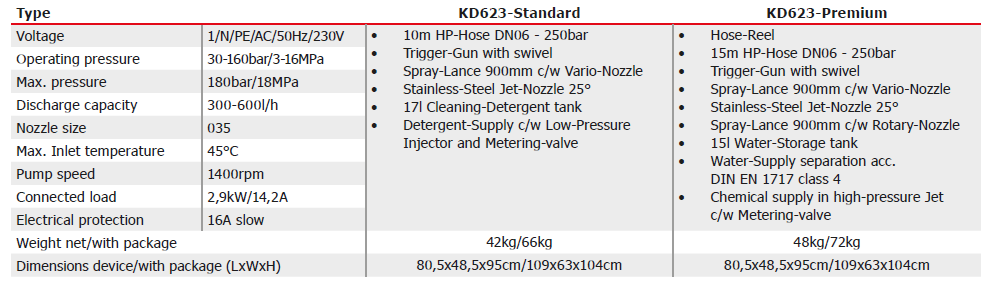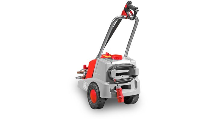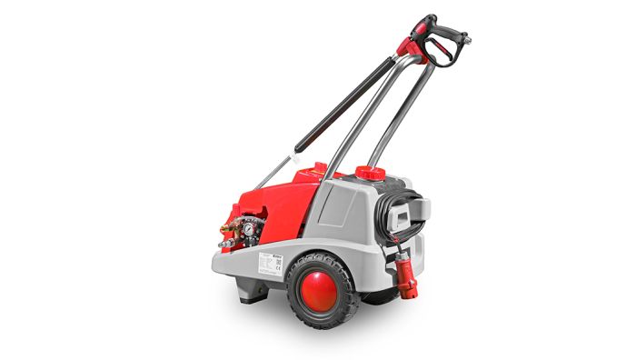 Self-Supporting, robust, rotation-moulded device-chassis, impact-resistant device-cover made of ABS, triplex-piston pump with brass pump head, nickel plated, high-performance ceramic piston, stainless-steel valves, leakage-return, start-stop system with switch-off delay, total-switch-off after 20min, unloader safety-valve c/w infinitely variable pressure and quantity regulation, 2 large rubber wheels for rough terrain, storage possibility for all accessories, rotary on-off switch robust and lockable, 5m connection cable, removable ergonomic drawbar.