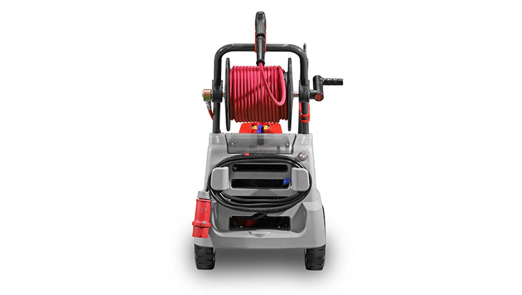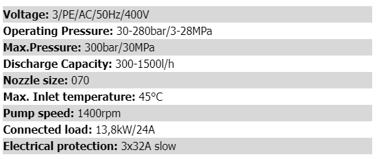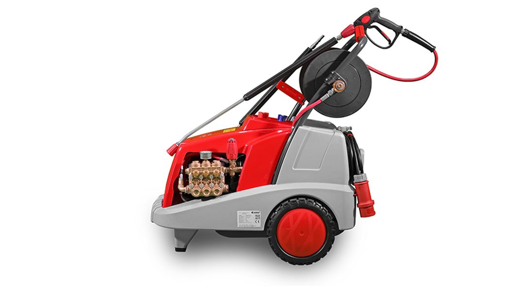 Self-supporting, robust, rotation-moulded device-chassis, impact-resistant device-cover made of ABS, triplex-piston pump with brass pump head, nickel-plated, high-performance ceramic piston, stainless-steel valves, leakage-return, start-stop system with switch-off delay, total-switch-off after 20min, unloader safety-valve c/w Infinitely variable pressure and quantity regulation, 2 large rubber wheels for rough terrain, storage possibility for all accessories, robust rotary on-off switch, 7,5m connection cable, removable ergonomic drawbar.