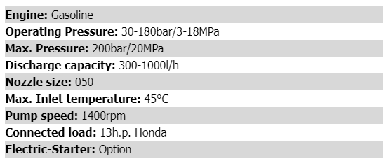 Robust, corrosion-resistant, self-supporting device chassis, with tilt-proof equipment buggy, made of robust steel pipe galvanized and powder-coa- ted, triplex-piston pump with brass pump head, high-performance ceramic piston, stainless-steel valves, leakage-return, gearbox for reducing the high-pressure pump speed, 2-fold safety system, unloader safety-valve c/w Infi nitely variable pressure and quantity regulation and safety-valve, automatic load-idle speed control, 4 large ruber-pneumatic tires for rough terrain, with a patented wheel brake, external detergent supply.
