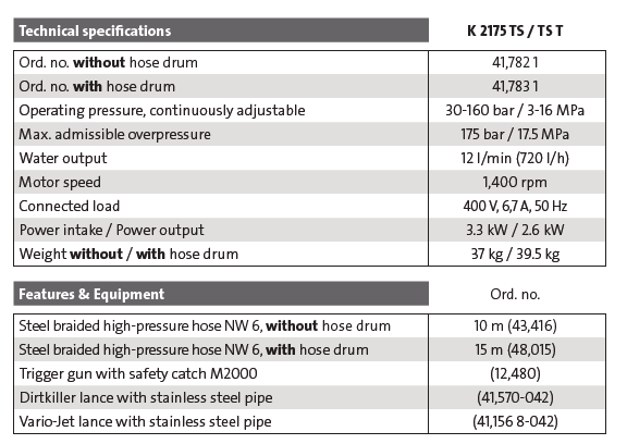 The Kränzle K 2000 line is perfectly geared to your various requirements of highly powerful pressure cleaning machines. Slow running1400 rpm electric motors with a power intake of up to 3.3 kW in conjunction with working pressures of up to 180 bar provide first class results. Designed, of course, with the Roto-Mold trolley, and with integrated hose drum according to model and Dirtkiller and vario jet lance as a standard including practical neat arrangement for efficient handling during operation.