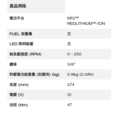 • 強大的 12 伏特馬達:提供高達 47 Nm 的扭力