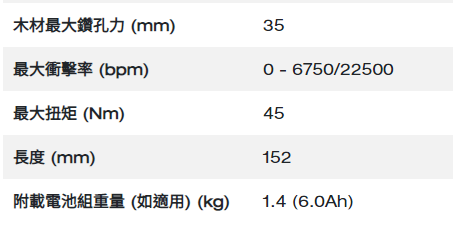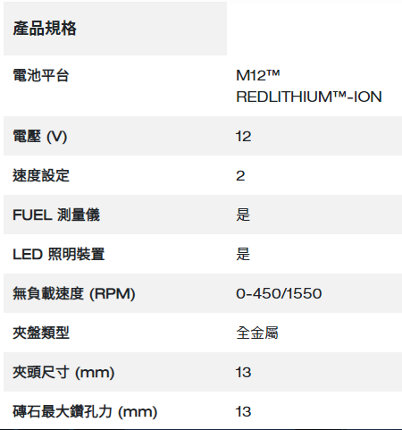 • 13 毫米全金屬夾頭,提供最大的耐用性、抓握力和鑽頭保持力