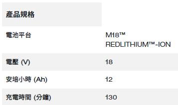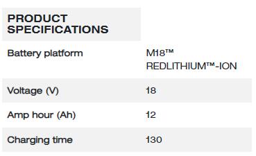 - 新款 M18™ 12.0 Ah HIGH OUTPUT™ 鋰電池組提供的電力比 M18™ REDLITHIUM™-ION 紅鋰電池組高 50%