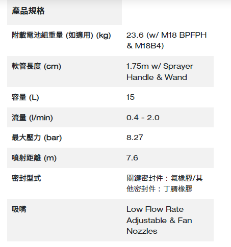 - 如搭配 M18™ REDLITHIUM™-ION 4.0 Ah 電池,每次充電可噴灑 12 罐水