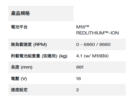 - MILWAUKEE™ POWERSTATE™ 無碳刷馬達提供更高的效率,運行時間更長,動力更強