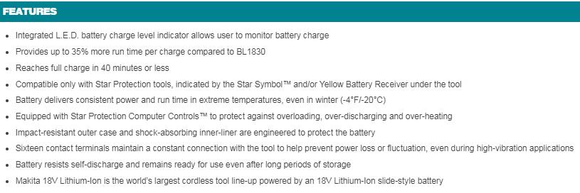 The Makita 18V LXT® Lithium-Ion battery charges faster and works longer than standard lithium-ion batteries, giving you and your cordless tools unmatched performance and productivity to take on the most demanding applications. The Makita 4.0 Ah battery combines more run time (35% more run time per charge than the Makita BL1830 battery) with a category-leading charge time of only 40 minutes, so it spends more time working and less time sitting on the charger. For added convenience, it also features an L.E.D. charge level indicator to monitor battery charge.