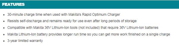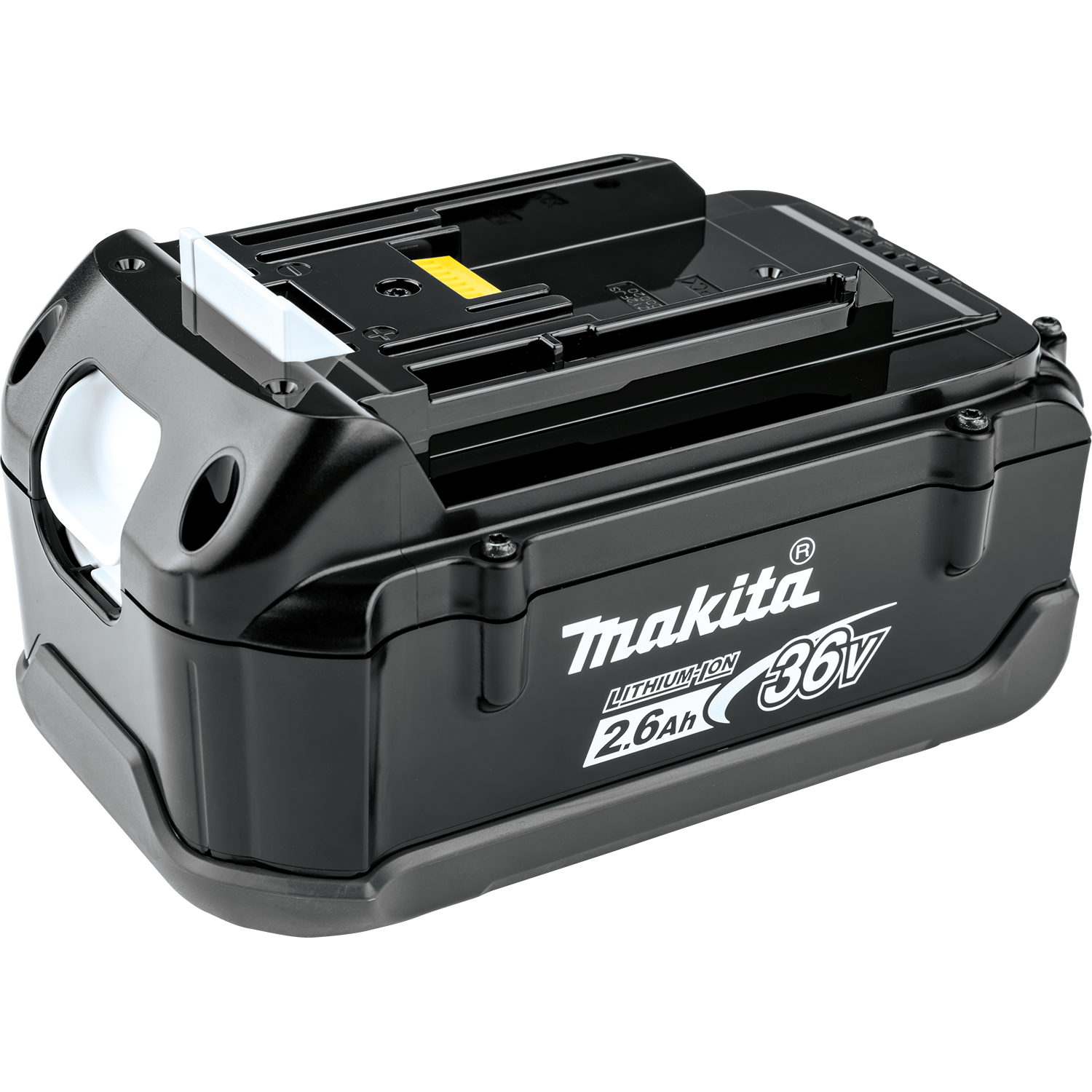 The Makita 36V Lithium-Ion battery reaches a full charge in 30 minutes, so it spends more time working and less time on the charger. Makita Lithium-Ion battery also provides longer run time so you can get more work finished on a single charge.