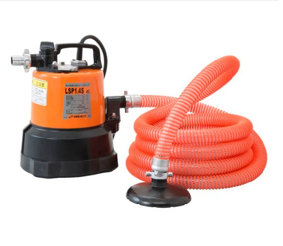 The Tsurumi LSP1.4S is another specialized submersible dewatering pump, designed for efficient water removal in shallow areas using a supplied hose for suction.